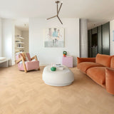 Experience the highest level of creativity with the carefully-crafted French herringbone collection. Each flooring boasts a unique visual composition featuring a characterful oak design. The brushed texture and natural color variations, characteristic of wood, add a playful diagonal interplay of lines. Transform any space with an authentic twist, without the hassle of installation. The long and narrow plank format allows for quick and easy installation with just a simple click and go.