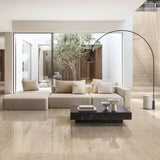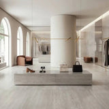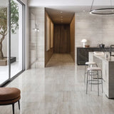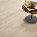 Travertino depicts the vein-cut, where the block of stone is cut following the veins, with a look that softens the contrasts without losing recognisability and character; the tonal variations are nuanced and refined, bold and never too strongy.