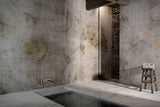 A natural stone pattern in warm grey tones splashed in a plastered feel and round fossil shapes. Two colour options for a smoother feel or a wall full of personality.