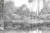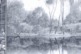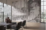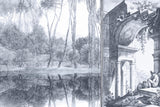 Des troncs hauts et élancés se reflètent dans des eaux calmes. Le regard s'attarde sur une scène peuplée d'un berger allongé à l'ombre d'une arche de mémoire classique. En harmonie avec l'histoire, la nature crée un motif évoquant un capriccio du XVIIIe siècle. Ce motif interprète librement le thème de la collection « Sur les traces du Grand Tour », entre vues idylliques, détails architecturaux et villes d'art à l'élégance intemporelle.
