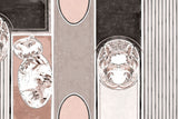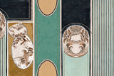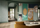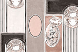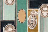 This wallcovering takes inspiration from cameos, exquisite gems that blend art, history, and elegance. The decorative elements are beautifully framed with marble pilasters featuring gold accents and alternating with ideal millerighe designs, further solidifying the theme.