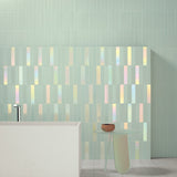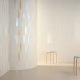 Prisme is a study that investigates the reactions of light on different glaze applications. After many tests in the ceramics field, we found the holographic finish capable of drawing the light spectrum, thus Hologram was born, a glossy surface that takes on different colors with the changing of the light. Applied on 5x25cm sizes, Prisme evolves in 4 colors: Blanc, Beige, Vert, and Rose. Each color has both a matt and glossy surface and is offered in a mix completed by a holographic finish that creates an iridescent visual rhythm and redefines contemporary surfaces.