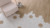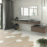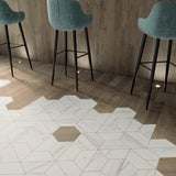 Three natural wooden tones and a calacatta inspired stone conforming the unusual elegance of these shapes.