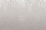 Enorme toon-op-toon palmbladeren overlappen elkaar en worden weerspiegeld in het glanzende oppervlak van de moiré-stof, die lijkt op zwoele rimpelingen op het oppervlak van een meer.